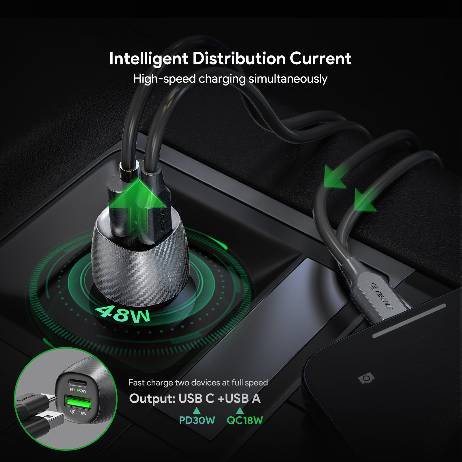 48W PD&QC CAR CHARGER +3FT USB-C TO 8PIN CABLE