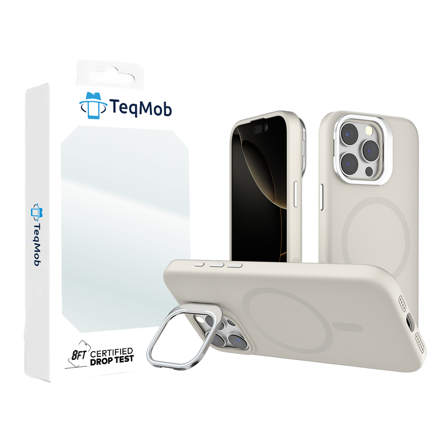 Off-White Silicone Camera Kickstand with Magnetic Compatibility for iPhone 16 Plus with package